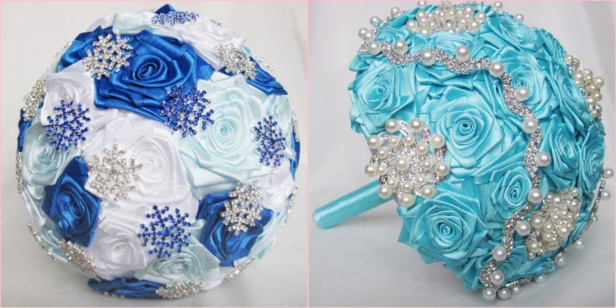 Такие варианты выполнены из блестящих камней или атласных лент, смотрятся очень ярко, эффектно и красиво. Если не хотите весь день ходить с таким букетиком, то можно использовать его только во время фотосессии на улице, а на банкет взять цветы.