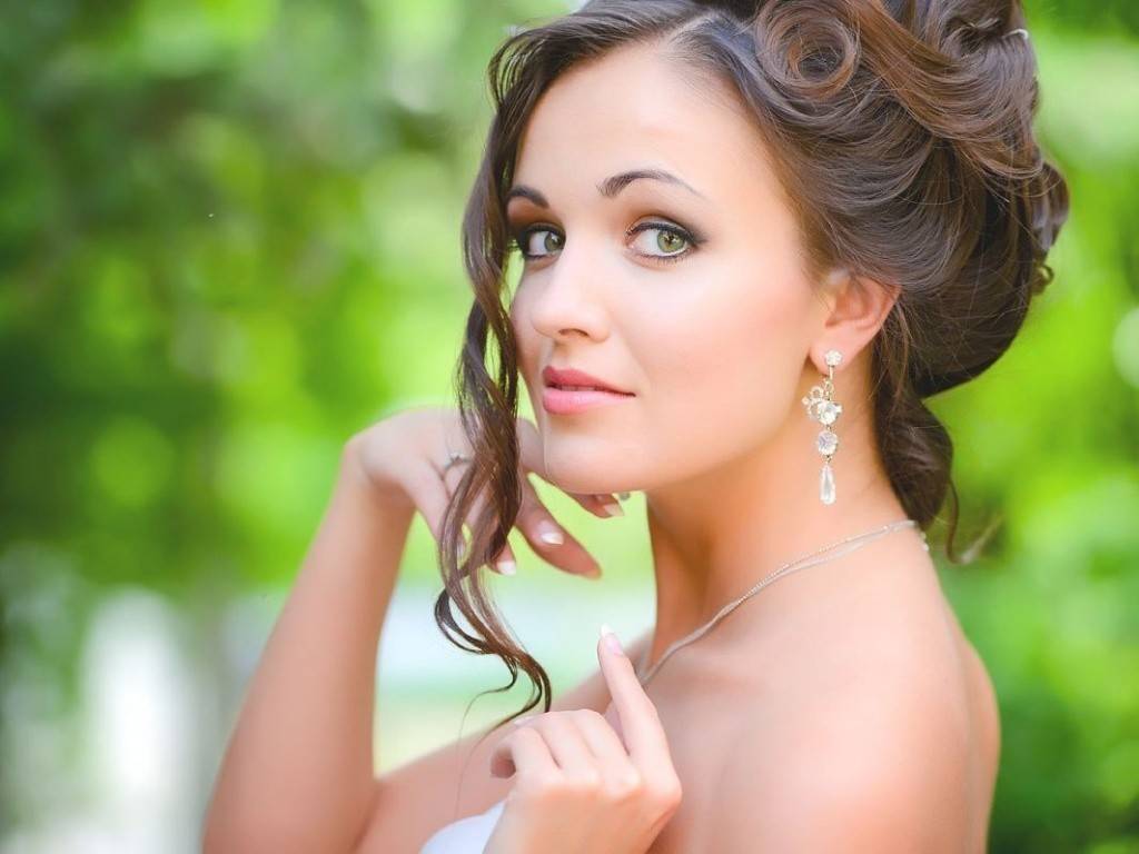 Укладка должна хорошо сочетаться и с материалом наряда невесты – продумайте все до мелочей. Так, для атласного платья подойдут прически гладкие. Укладку можно собрать в гладкий, крупный пучок, что позволит подчеркнуть блеск волос.