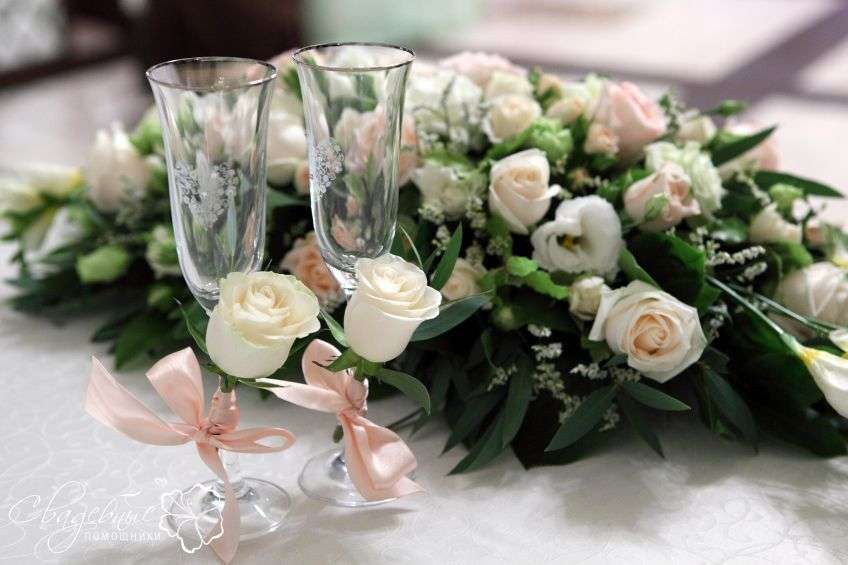 Итак, выбранные для декора цветы нужно подрезать так, чтобы не было видно стебля. Бутоны необходимо в течение нескольких часов вымачивать в холодной воде, чтобы они набрали достаточное количество влаги. На каждый срез крепится кусочек мокрой ваты и фиксируется на основу композиции или сразу на декорируемую поверхность. После того, как композиция полностью сформирована и закреплена на бокале, необходимо все накрыть пакетом и хранить в холодильнике до дня свадьбы.