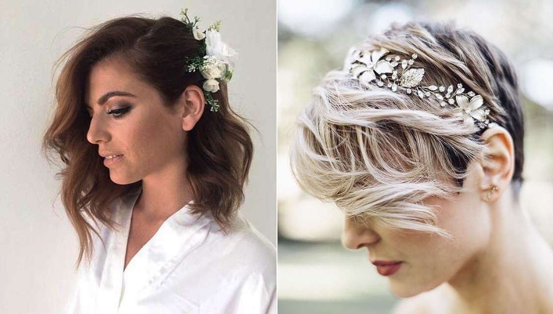 Можно взять любые белые, серебристые или перламутровые заколочки, и сделать на голове определенный рисунок из волос и заколок. Это может быть венец вокруг головы или абстрактные загогулины. Также хорошим вариантом будут свадебные прически на короткие волосы с живыми цветами — цветочки фиксируются с помощью заколочек и невидимок, и получается красиво.