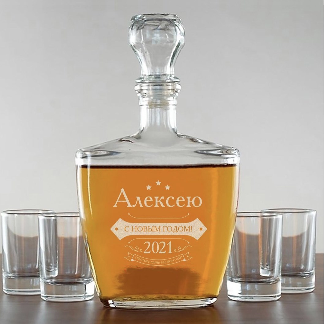 Особая четырехгранная бутылка с коротким горлом и притертой фигурной пробкой, используемая для хранения и подачи крепких спиртных напитков, а выгравированное имя именинника стилизует ёмкость.