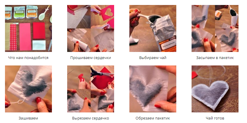 Насыпаете внутрь рассыпной чай – в большинстве своем достаточно чайной ложки или менее того на пакетик, зашиваете щель. Далее вырезайте аккуратно ножничками из красной бумаги сердечки и привязываете его к чайному пакетику, обрежьте остаток нитки – подарок готов.