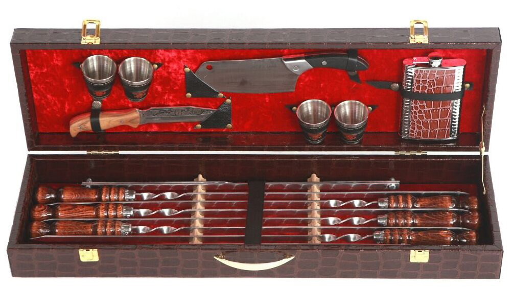 Красивый подарочный набор для комфортного приготовления блюд на мангале (включает шампура, топорик для мяса, решетку и другие аксессуары).