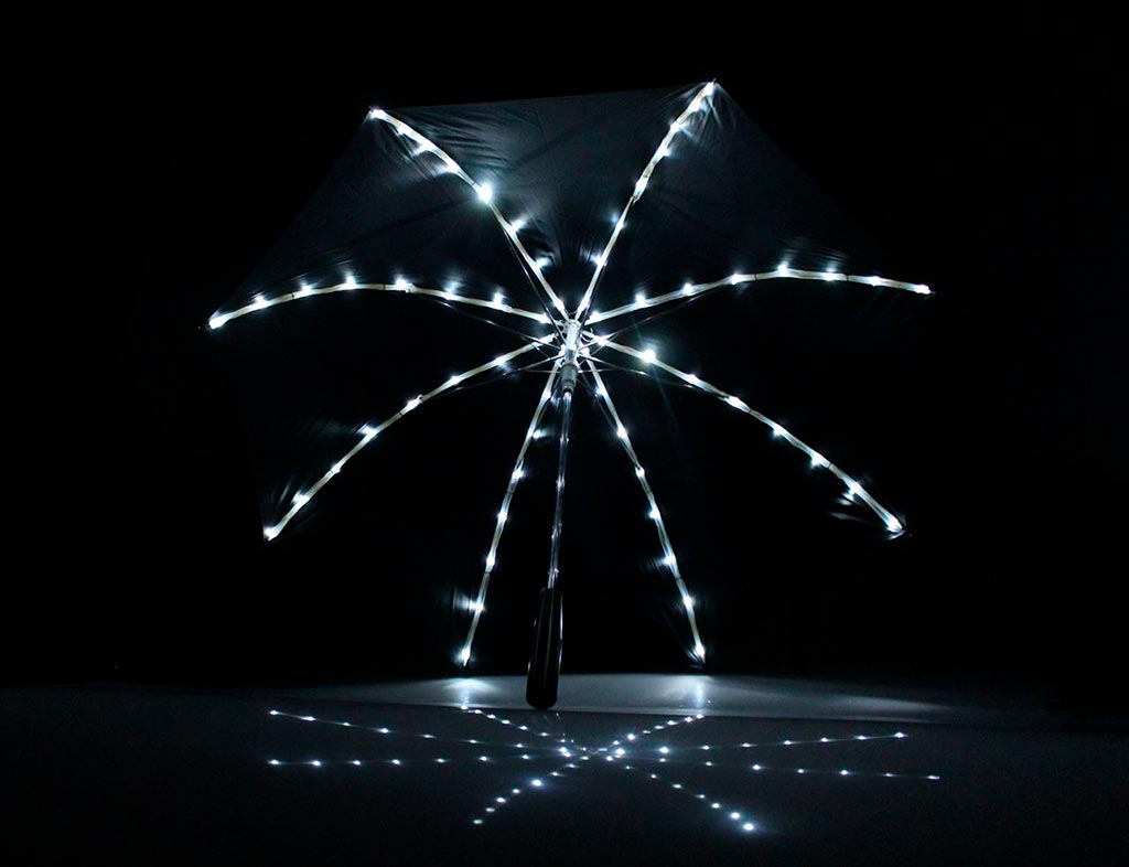 Стильная защита от осеннего проливного дождя. Поверхность оснащена синими светодиодами, и цвет не раздражат. Светлячки на зонте могут мигать и переливаться разными цветами. Питание гаджета от 3 пальчиковых батареек.