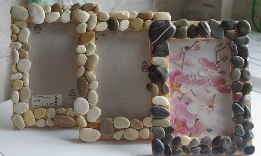 Для ее изготовления потребуется, кроме гальки, плотный картон, бесцветный универсальный клей. Выберите фото, которое вам нравится, и на котором запечатлен трогательный момент совместной жизни. Обработайте его при помощи компьютерных программ, самостоятельно или обратитесь к специалистам. Приложите фото к основе (картону), очертите контур. Затем очертите второй на 5-7 см больше первого. Вырежете рамку. С обратной стороны приклейте фото, сверху него плотный картон. Сделайте ножку-опору, прикрепите к рамке. Последний этап — декорирование. По внешнему периметру приклейте ракушки, морские камешки.