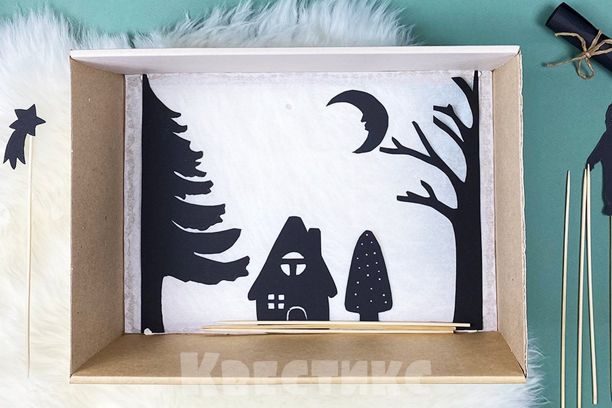 - Распечатайте из интернета шаблоны для театра. Это могут быть герои из сказок, деревья, дома, транспорт. Вырежьте их и перенесите на чёрный картон или плотную чёрную бумагу. Также можно сразу печатать на картоне шаблоны чёрного цвета, вырезать и наклеивать на картонную подложку.