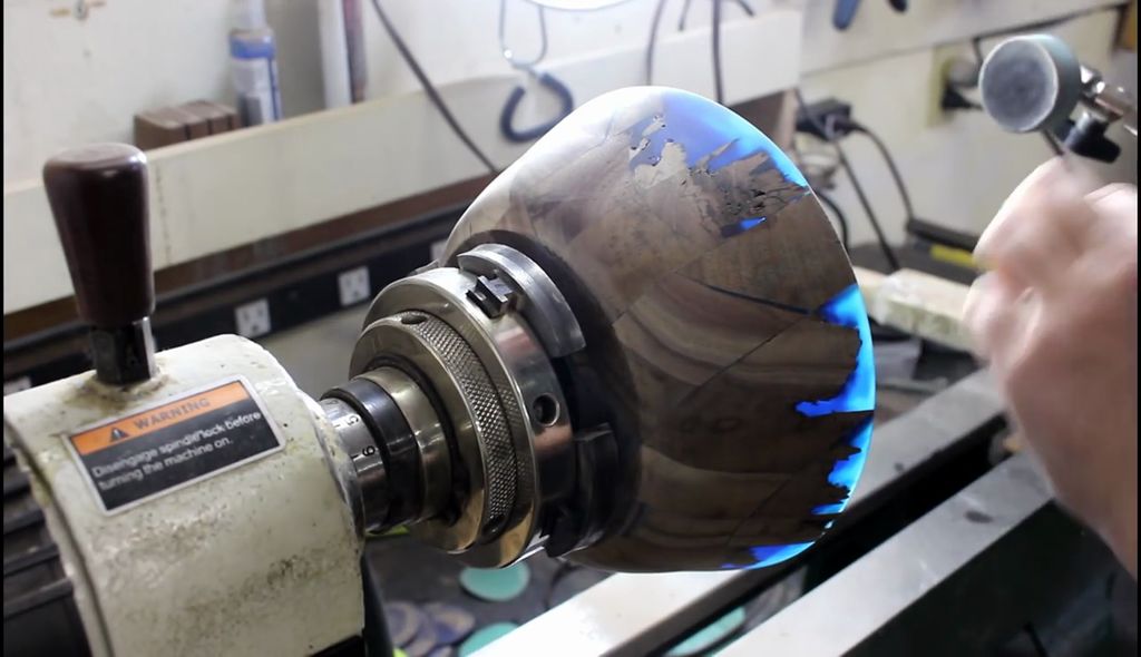 Если предмет мебели заливной, то есть полностью состоит из эпоксидного материала, его полировать нужно с особой тщательностью. Застывшую смолу полируют с применением специальной машины. Процедура полировки может быть произведена мастером самостоятельно.